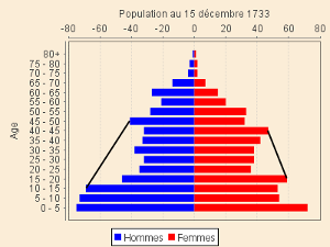 Quant à la pyramide de 1789, elle retrouve une allure plus classique, digne d'un vrai recensement, très pyramidale, avec encore les déficits des âges intermédiaire, relativement faibles, surtout perceptibles chez les hommes, confirmant plus de 50 ans après la consigne du sel de 1734 le caractère conjoncturel mais répétitif des émigrations.