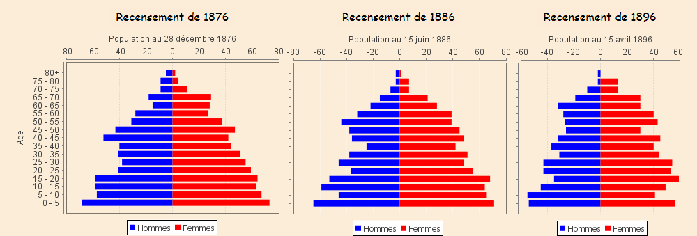 Enfin, la pyramide de 1896 prolonge les constatations faites en 1886 (poursuite des déficits masculins jusqu'à 60 ans) mais on doit noter la réduction globale des effectfs et le vieillissement de la population caractérisée par la raréfaction des plus jeunes (diminution du nombre des mères potentielles et peut-être apparition d'une tendance à la limitation des naissances) et l'augmentation de la proportion des plus âgés (par allongement de la durée de vie).
