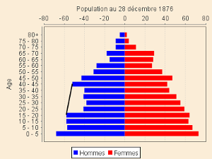 La pyramide de 1876 présente une grande régularité des effectifs féminins : l'émigration semble réduite ou, en tout cas plus diffuse.