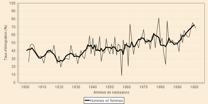 A la fin du XVIIIe siècle et au cours du XIXe, l'émigration s’intensifie et ne s’arrête pas jusqu’à la fin de ce dernier siècle. Les émigrations deviennent abondantes et permanentes au point de déstabiliser la pyramide des âges qui, avec l'allongement de la durée de la vie, devient celle d’une population nettement vieillissante.