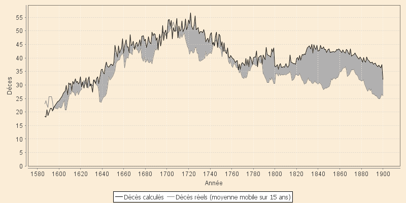Enfin, une trace évidente mais imprécise des émigrations peut se trouvée dans le fait que nombre de Fontcouvertins ne sont pas morts dans leur communauté (nous ne retrouvons pas leur décès). Une comparaison du nombre de décès annuels enregistrés à celui auquel on pourrait s’attendre du fait des naissances indique alors, sinon le nombre exact, du moins les époques où les déficits apparaissent, voire donne une idée globale de l’intensité des mouvements.