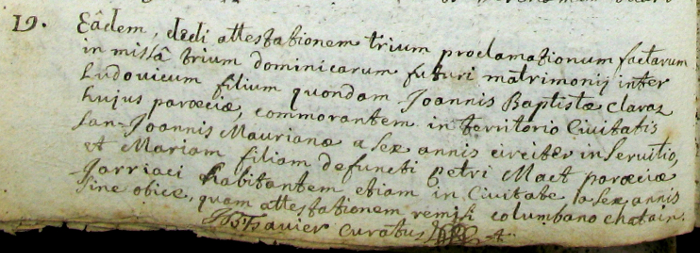 Dans l'attestation ci-dessus, Louis Claraz est natif de Fontcouverte mais en service à Saint-Jean depuis 6 ans. Marie Mat est originaire de Jarrier mais habite aussi Saint-Jean depuis 6 ans. On conçoit qu'ils se marient dans la Cité mais que devriendront-ils ? Louis quittera-il temporairement ou définitivement sa paroisse d'origine ? Marie est inhumée à Fontcouverte, Louis n'y a pas de décès connu !