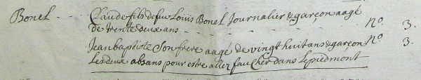 Claude et Jean Baptiste [Claraz] Bonnel sont partis en 1726 faire les foins dans le Piémont. Activité a priori bien saisonnière. Mais peut-être y retourneront-ils ou même y resteront-ils ? La structuration de la population nous dit qu'ils reviendront, se marieront à Fontcouverte et Jean Baptiste y mourra. L'identification incertaine de Claude ne nous donne pas de décès.