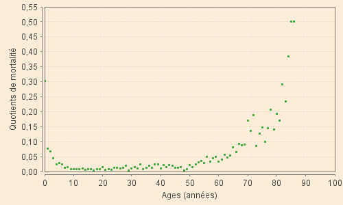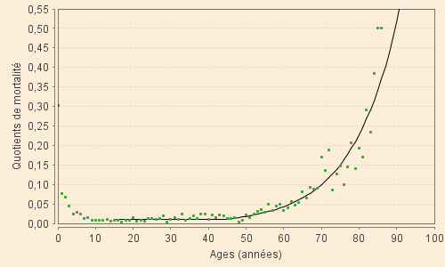 A leur suite nous utilisons ci-dessous, comme exemple, les quotients de mortalité des Fontcouvertins nés dans la première moitié du XVIIIe siècle, hommes et femmes confondus. Ceux-là illustrent bien l'évolution des probabilité de décès aux âges compris entre 10 et 90 ans après que la forte mortalité des plus jeunes a pratiquement totalement disparu.