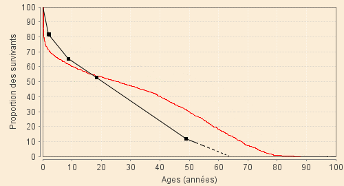 Pour interpréter l'incidence de la peste suivant les âges, nous nous référons à la mortalité générale connue sur la période 1601 - 1650 présentée sous forme de sa courbe de survie. Sur le graphique de cette courbe (en rouge) est superposée la survie, calculable approximativement à partir du tableau précédent, des personnes mortes de la peste (en noir).