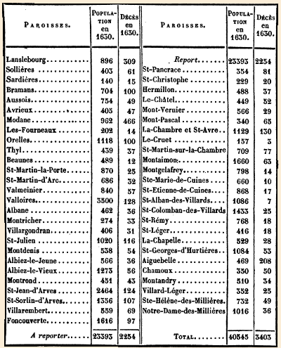 Pour nous, tenant compte des seules 64 morts probablement pesteuses et d’une population de 1 200 âmes, le rapport est de 5,3 % valeur nettement inférieure à la moyenne mauriennaise de 8,3 % (des paroisses de Haute-Maurienne et celle de la Chambre auraient payé un tribut de 30 à 50 %).