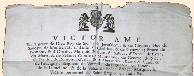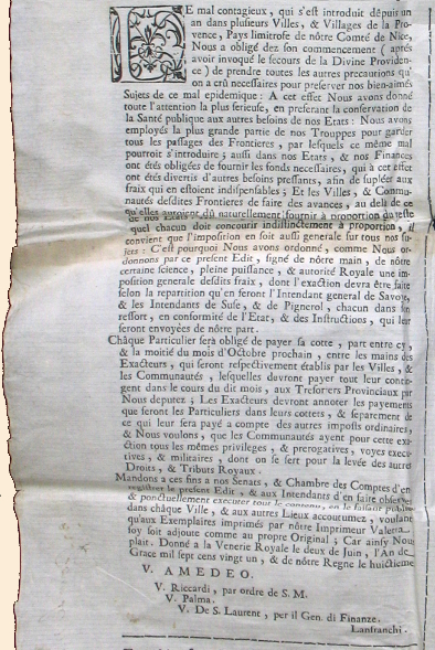 Les fonds nécessaires à ces actions conduisent le roi Victor Amédée 1er à promulguer le 2 juin 1721 un édit instaurant une imposition spécifique et générale sur la population. L'édit est proclamé et affiché à Fontcouverte le 10 août 1721 par le secrétaire Jean Gilbert.
