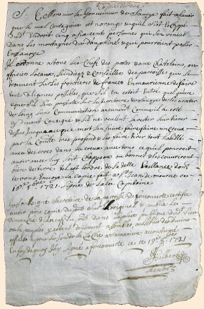 S. E. Monsieur le Gouverneur de Savoie fait savoir que le mal contagieux est à Orange et qu'il s'est échappé dudit endroit cinq à six cents personnes qui sont venues dans les montagnes du Dauphiné et qui pourraient passer en Savoie. Il ordonne à tous les chefs des postes et aux châtelains ou officiers locaux, syndics et conseillers des paroisses qui se trouvent sur les frontières de France en Maurienne de faire toutes diligences possibles que s'il en était entré quelqu'un et qu'il s'en présente sur le territoire de Savoie de les arrêter de loin sans communication aucunement comme il a été ci-devant consigné et s'ils ne veulent s'arrêter, leur tirer dessus jusqu'à ce que mort s'en suive, faire faire un creux par la communauté très profond et les faire tirer tout habillé avec des crocs dans le creux avec tout ce qu'il pourrait avoir avec lui soit chapeau ou bonnet et les couvriront bien de terre tel est l'ordre de la dite Excellence dont je vous envoie la copie fait à St Jean de Maurienne ce 16 octobre 1721 Signé de Lalo Capitaine.