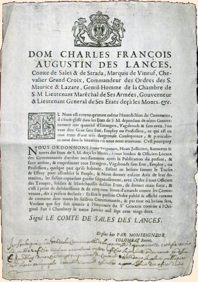 Plus significatif de la rigueur avec laquelle la prévention des passages d'étrangers venant de Provence par le Dauphiné est l'ordre du 16 octobre 1721 du Gouverneur de Savoie précisant les consignes strictes en cas de tentative de pénétration sur le sol savoyard. Les migrants sont bien mal vus puisqu'ils risquent d'être abattus et enterrer sans ménagement. Pour être clair, voici la transcription du texte de l'ordre.