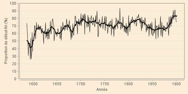 Le graphique suivant montre la proportion annuelle (avec la moyenne mobile sur 10 ans) des personnes dont on connait le début et la fin de vie, la valeur étant portée sur la date de début de vie.