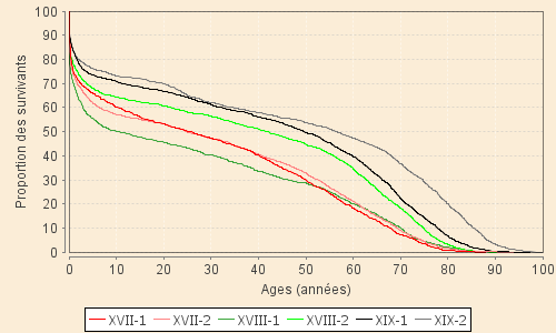 La courbe de survie donne la proportion des nouveaux-nés qui atteignent un âge donné. Par exemple, parmi les enfants nés dans la première moitié du XVIIIe siècle (courbe la plus basse du graphique), 50 % survivent à leur dixième anniversaire, 30 % atteignent l'âge de 50 ans.