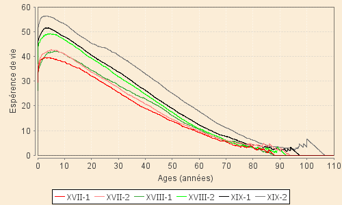 Dans l'écoulement du temps historique, la succession des courbes traduit clairement l'évolution de la mortalité tant infantile que sénile. Si l'on exclut pour l'instant la courbe XVIII-1, une nette amélioration progressive de la situation se manifeste. Par exemple l'âge auquel disparait la moitié de la population se situe vers 25 ans au XVIIe siècle et vers 60 ans dans la deuxième moitié du XIXe siècle. Ces progrès proviennent ;