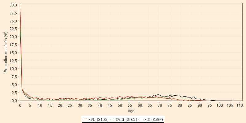 Au XIXe siècle, si la mortalité infantile n'évolue pratiquement plus, l'apparition de plus en plus tardive des effets de la vieillesse prend tout son effet pour donner des centenaires... qui mourront au XXe siècle, voire au XXIe.