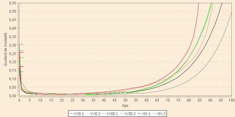 Le graphique suivant donne une idée de cette probabilité (sous forme de quotients annuels : un quotient de 0,05 correspondant à une probabilité de 5 % de mourir une année d'âge donnée) depuis l'année d'âge 0 jusqu'à une année d'âge voisine de celle du plus vieux mourant (on a tronqué les très rares centenaires nés à la fin du XIXe siècle morts au XXe, voire au XXIe). Les calculs sont menés sur les Fontcouvertins nés dans les demi-siècles successifs de manière à mettre en évidence les évolutions dans le temps.