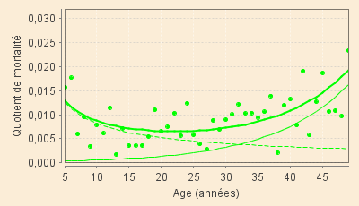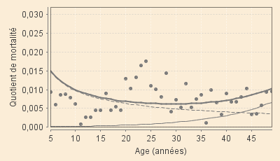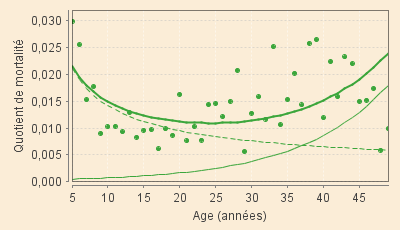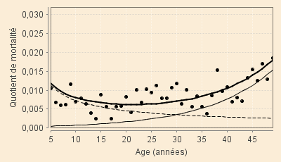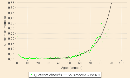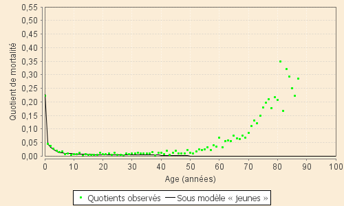 Les quotients de mortalité issus du sous-modèle des « jeunes » sont ainsi estimés, avec une bonne approximation, par :