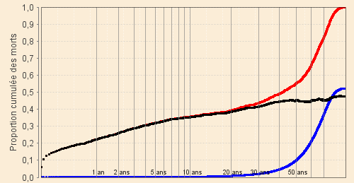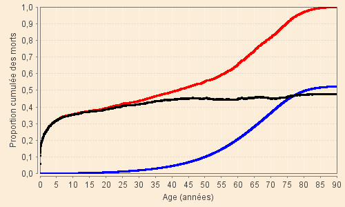 Le graphique suivant montre ces résultats sous forme de la proportion des morts cumulés avant un âge donné parmi les naissances d’une génération en prenant l’exemple des natifs de la période XVIII-2 (1751 - 1800) représentant un stade moyen sur toute l’entendue temporelle de notre étude (décès totaux en rouge, décès de type « vieux » en bleu et autres décès en noir).