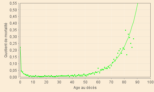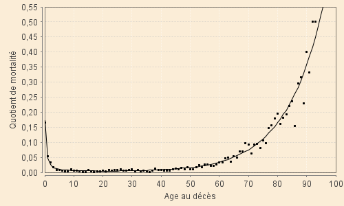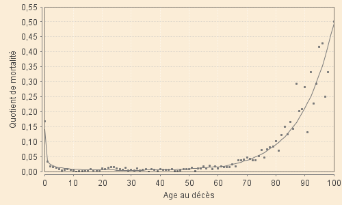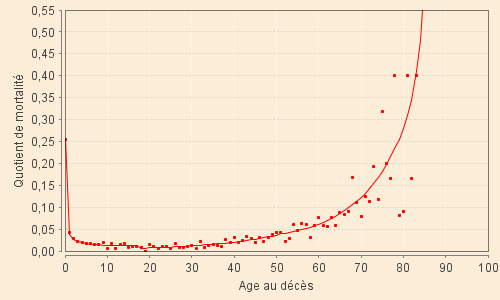 Le graphique ci-contre est relatif à la période XVIII-2 et donne les variations du coefficient annuel de mortalité entre 0 et 100 ans telles que données par le modèle. Il suit correctement la mortalité observée, malgré ses variations très fortes et rapides, jusque vers 25 ans. Il devient extrêmement faible jusqu'à 40 ans et prend des valeurs strictement nulles dès 50 ans.