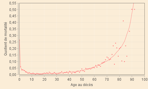 Enfin, voici les graphiques superposant le modèle global aux quotients observés sur l'ensemble de âges de 0 à 100 ans.