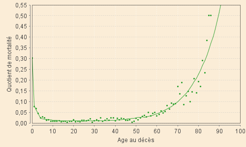 Les âges élévés conduisant à des quotients supérieurs à 0,55 ont été tronqués puisque correspondant à des taux très élévés calculés sur des échantillons extrêmemnt réduits (0,50 correspond souvent à 2 ou 4 survivants dont 1 ou 2 décèdent). L'âge au décès du dernier mourant justifie, généralement, l'extrapolation qui est faite par le modèle.