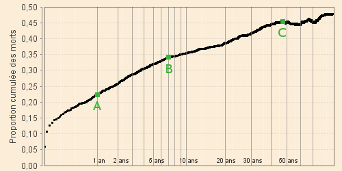La courbe noire peut alors être approximée par deux segments de droite de 1 an à 7 ans et de 7 ans à 48 ans suivis d'un troisième horizontal traduisant la stabilisation du cumul des décès à partir de 48 ans. Ces limites définies à vue sont représentées par les points verts A, B et C du graphique ci-contre.