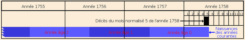 Le graphique suivant illustre la recherches des données nécessaires au calcul des Pa relatifs au mois normalisé 5 de l’année 1758 pour les décès à l'âge de a ans révolus.