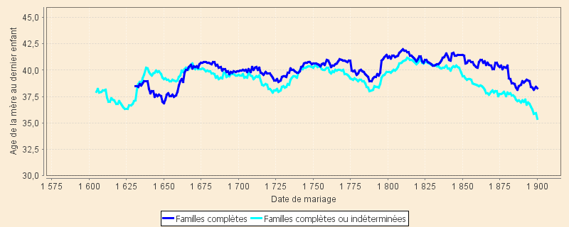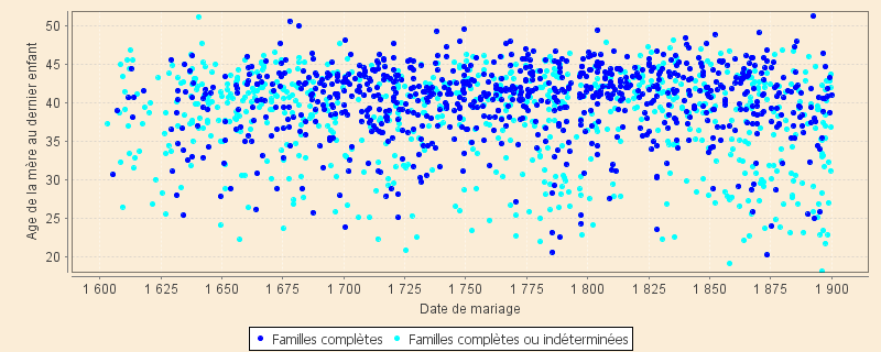 Un premier graphique donne, en fonction de la date mariage des mères et en bleu foncé, l'âge des mères des familles répurées complètes à leur dernier accouchement. On superpose, en bleu clair, les mêmes valeurs pour l'ensemble des familles complètes et indéterminées. La grande dispersion des valeurs obtenues est évidente et très disymétrique : les âges faibles ne sont limités que par la faible fécondité des très jeunes mères potentielles, les âges élevés étant plus strictement limités par la ménopause. On peut noter que cet âge se situe majoritairement entre 38 et 48 ans mais, peut-être seulement entre 38 et 43 ans à partir de 1875 environ tant pour les familles complètes que pour l'ensemble des familles complètes et indéterminées.