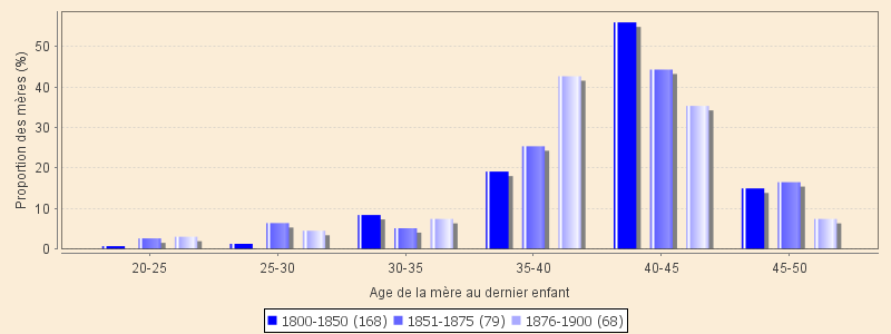 Bien que les effectifs soumis à l'analyse soient très réduits, le graphique suivant donne une représentation claire du phénomène. On compare pour chaque tranche d'âge la proportion des mères dans les trois périodes, la première pouvant pratiquement servir de référence de la fécondité naturelle dans la première moitiée du XIXe siècle.
