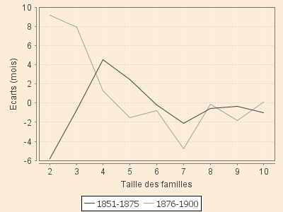 Elle ne peut se faire facilement qu'en se rapportant à des moyennes dont on connaît la piètre représentativité de la réalité des intervalles intergénésiques et dont nous devons nous contenter. L'analyse est réalisée en fonction de la taille des familles et en fonction du rang des naissances ; elle porte sur les écarts, exprimés en mois, observés par rapport à la période 1587 - 1850 de fécondité naturelle. Un écart positif traduit un allongement des intervalles entre naissances par rapport à ceux de la période de référence.