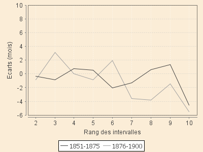 De façon très globale, l'intervalle moyen de la période 1851 - 1875 serait de 0,4 mois inférieur à la référence et supérieur de 1 mois pour ceux de la période 1876 -1900. Ces écarts sont très faibles et probablement peu significatifs.