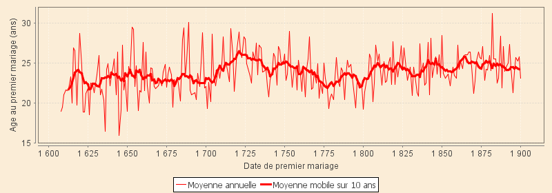 Une première façon pour les Fontcouvertines de retarder la naissance de leur premier enfant serait de différer leur mariage. Un graphique de l'âge moyen annuel de premier mariage et de sa moyenne mobile montre qu'il n'en est rien pour la période 1875 - 1900.