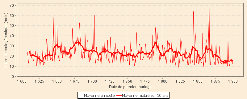 Sous les conditions ainsi retenues, le graphique suivant donne les variations de l'intervalle protogénésique annuel moyen et sa moyenne mobile sur 10 ans en fonction des dates de mariage.