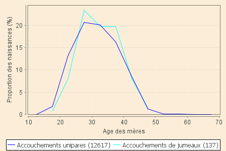 Le graphique traduit ces deux répartitions. Malgré la différence de taille importante entre les deux populations analysées, il y apparaît une différence graphique, les naisances de jumeaux aux âges des mères inférieurs à 25 ans étant, pour partie, reportées entre 25 et 40 ans. Un calcul précis, bien qu'incertain, montrerait cependant qu'il n'y aurait qu'une chance sur quatre pour que la distribution des âges des mères des accouchements gémellaires soit différente de celle des accouchements unipares.