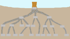 Renversant l'arbre, on peut aussi représenter les descendants d’une personne située « en haut » (à la base du tronc de l’arbre) d’où partent, vers le bas (comme des ramifications de la racine), ses enfants puis ses petits enfants mais dans cette représentation le nombre de descendants n’est plus systématiquement de deux à chaque ramification comme pour les ascendants.