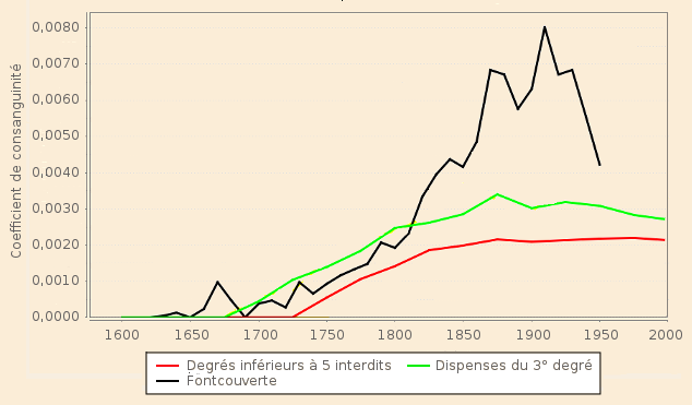 A en croire une simulation qui a été réalisée, l’influence du droit civil particulièrement tolérant à partir de 1861 semble être faible et incapable d’expliquer la forte hausse de fm d'ailleurs antérieure à 1861. Tout se passerait alors comme si c’était l’augmentation du nombre de mariages à consanguinité relativement élevée à l'intérieur de la communauté fontcouvertine qui interviendrait sur la moyenne. On est tenté de rapprocher ce fait de l’accroissement très important du taux de célibat définitif observé à partir de cette époque. Une crise de la nuptialité interviendrait-elle, limitant la proportion des personnes susceptibles de se marier, celles-ci ayant tendance à convoler avec des conjoints plus consanguins ?