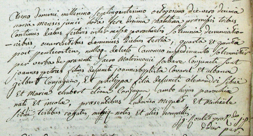 Les époux sont naturellement et pratiquement toujours mentionnés avec leurs prénoms ainsi que le nom et le prénom des pères des époux, l'identité des mères étant systématiquement ignorée jusqu'en 1770. On doit aussi noter que, suivant les règles de l’identité sociale, le prénom du père d’un veuf n’est généralement pas mentionné et une veuve se remariant est accompagnée seulement, dans les meilleurs cas, des nom et prénom de son dernier époux décédé.