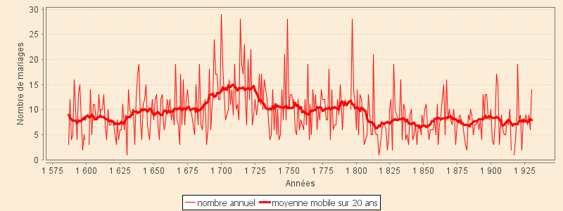 Le graphique très simple du nombre annuel des mariages au cours des trois siècles qui nous intéressent (que nous avons prolongé jusqu’en 1950 pour illustrer les mariages des personnes nées en fin du XIXe siècle) révèle des fluctuations importantes qu’on peut attribuer, faute d'interprétation, au hasard. Mais il apparaît aussi des tendances évolutives, révélées par la moyenne mobile, non négligeables que l’on est tenté de lier aux variations de volume de la population pour les tendances à long terme, aux fluctuations dans la pyramide des âges et aux contraintes sociales ou économiques au cours du temps pour ce qui concerne les variations à moyen terme.