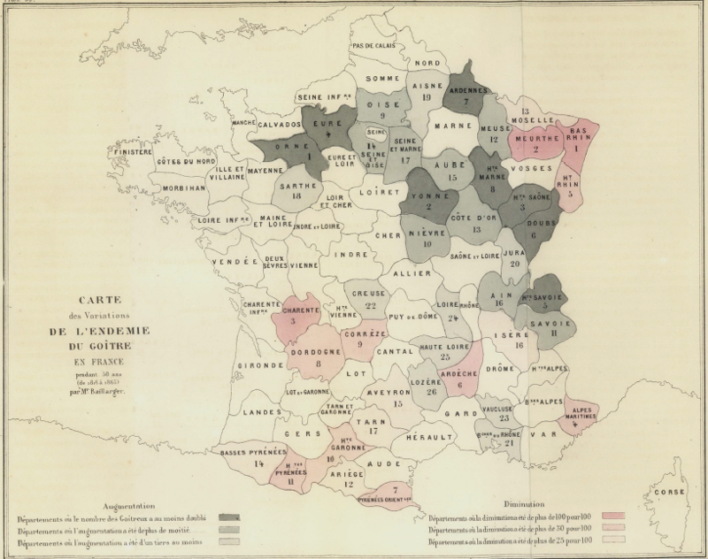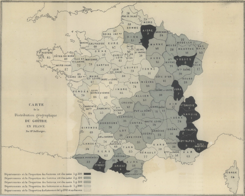La carte suivante de la commission française donne une répartition géographique départementale de l'endémie des goitres vers 1870. Le numéro porté dans chaque département est son rang dans le classement par ordre décroissant du taux de goitrie. La Savoie fait figure de proue !