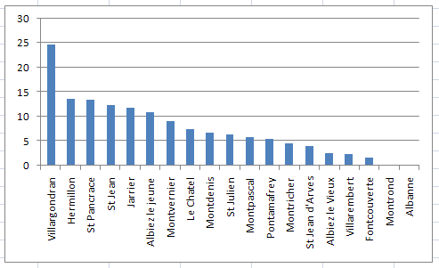 Dans le graphique qui tient compte de cette permutation, les diverses paroisses sont classées par valeurs décroissantes des taux. Villargondran se signale par un taux relativement élevé (le curé aurait-il fait preuve de plus de zêle que ses voisins ?) Globalement, il apparaît que les villages les plus atteints se situent dans la vallée de l'Arc, les seuls présentant des taux faibles, voire pratiquement nuls, faisant partie des paroisses de l'Arvan ainsi qu'Albanne. De ce point de vue, Saint‑Pancrace et Jarrier feraient bien partie de la vallé de l'Arc étant largement ouverts vers Sain‑Jean‑de‑Maurienne. L'altitude (estimée sans doute grossièrement comme étant celle de l'église des villages) n'est pas strictement discriminante. A titre d'exemple, Montdenis et Montpascal situés à 1400 mètres avoisinent par leurs taux Saint Julien n'atteignant pas 700 mètres. Inversement Albiez‑le‑Jeune présente un taux important malgré son altitude de 1500 mètres.