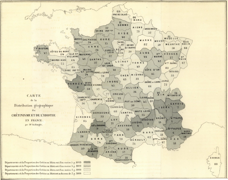 On peut alors admettre que l'idiotie est relativement importante, relevant de causes différentes de celles du crétinisme (on site l'alcoolisme). Les départements alpins se distingueraient encore, sans doute, par l'abondance relative des crétins.