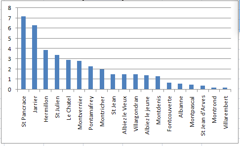 Albiez-le-Vieux | 930 | 7 | 3 | 10 | 1,1 | 7 | 7 | 14 | 1,5 | 24 | 2,6 |