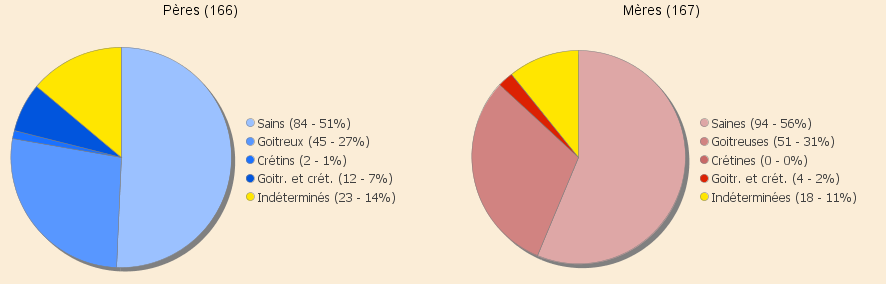Plus de 50 % des pères ou des mères de crétins seraient sains. 30 % seraient goitreux, les femmes et les hommes étant dans un rapport conforme à la statistique générale des goitreux. 2 % ou 1 % seulement des pères ou des mères seraient crétins. Quant aux mères goitreuses et crétines, elles seraient bien moins nombreuses que les pères souffrant des mêmes maux. Ce dernier fait serait sans doute à rapprocher de la stérilité accentuée des crétines et, peut‑être, d'une pression sociale importante.