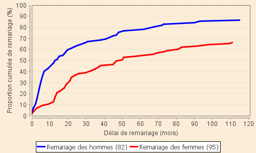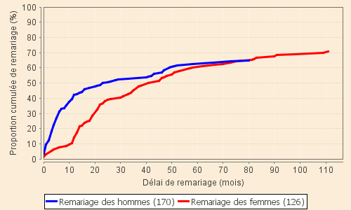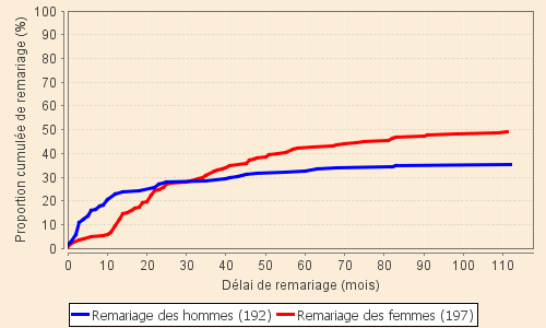 Le graphique est relatif aux veufs et veuves de la première tranche d'âge qui correspondent à l'époque de la vie où la famille est en pleine construction. La réparation du départ d'un conjoint s'impose fortement avec la différence des conséquences évoquées ci-dessus suivant le sexe. La différence constatée est très nette tant sur le niveau que sur la rapidité de remariage .