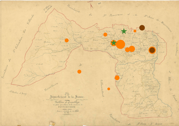 A L'Alpettaz, des personnes (étoile verte) citées dans l'épisode ne meurent pas de peste dans le village qui ne connait pas de morts pesteux au cours de l'épidémie.