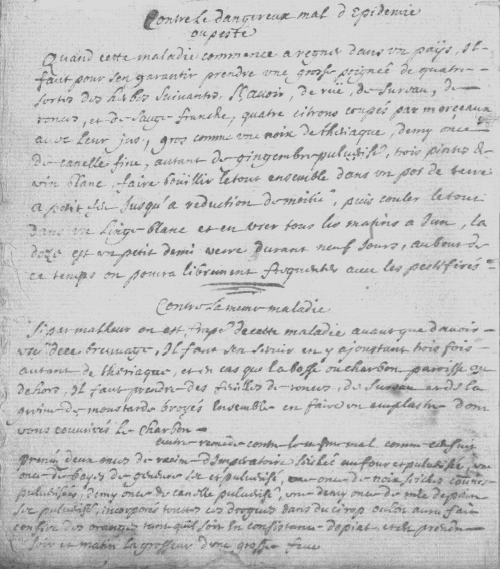 Quand cette maladie commence à régner dans un pays, il faut pour s’en garantir prendre une grosse poignée de quatre sortes des herbes suivantes savoir de ruë, de sureau, de ronces et de sauge‑franche, quatre citrons coupés par morceaux et de leur jus, gros comme une noix de thériaque, demi once de cannelle fine, autant de gingembre pulvérisé, trois pintes de vin blanc, faire bouillir le tout ensemble dans un pot de terre à petit feu jusqu’à réduction de moitié, puis couler le tout dans un linge blanc et en user tous les matins à jeun, la dose est un petit demi verre durant neuf jours, au bout de ce temps, on pourra librement fréquenter avec les pestiférés.