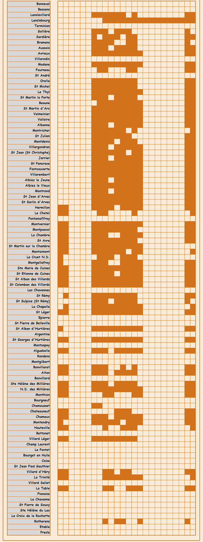 Dans le document épiscopal des décès en Maurienne vers 1630, 97 paroisses ont été reconnues mais la valeur de leurs informations est très variable, parfois pratiquement nulle voire inexistante pour ce qui nous intéresse. Seules 40 paroisses environ sont susceptibles d'être étudiées.