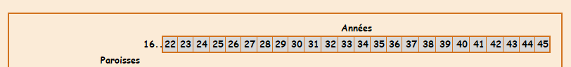Le tableau suivant donne les années civiles où au moins un décès est enregistré (éventuellement par erreur) pour chaque paroisse renseignée dans le document.
