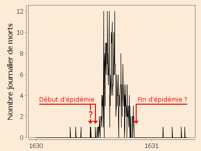 La date de début d’épidémie risque parfois d'être très largement anticipée. On doit en effet se méfier des épidémies non pesteuses, en particulier celles de dysenterie qui sévissent en été, saison où l'épidémie de 1630 se manifeste, anomalies qui peuvent alors être incluses dans l’épidémie principale de peste tant que celle-ci n’a pas atteint de façon continue un niveau de décès exceptionnel.