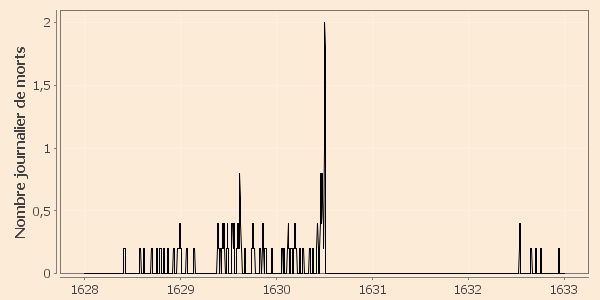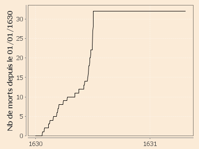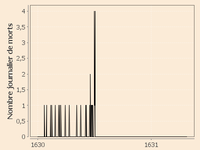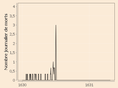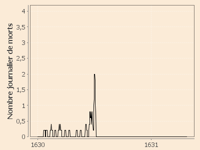 Le 16 juin 1630 l’épidémie débuterait tout d’abord dans un premier épisode avant d’éclater le 2 juillet 1630 avec 4 morts ce jour et 4 autre le 4 juillet 1630.
