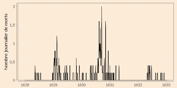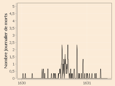 Le graphique révèle la période épidémique de 1630 avec cependant une grande difficulté de détermination du début exact de l’épidémie et encore plus de sa fin dans la mesure où les décès journaliers naturels introduisent un bruit de fond relativement important dans lequel se noient les derniers décès pesteux.