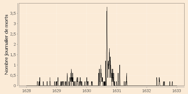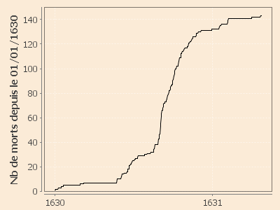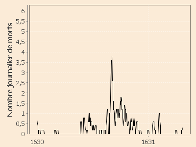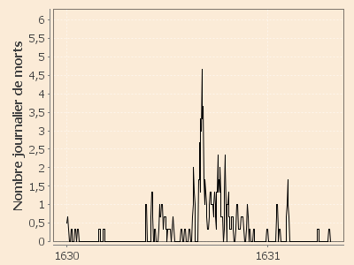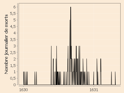 Début d'épidémie estimée : 18 août 1630 (l'épisode du 25 mai 1630 au 11 août 1630 serait probablement non pesteux).